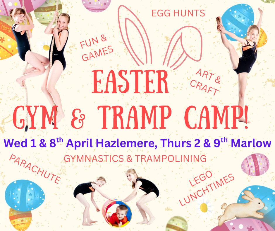 Tumble & Tramp Camp (ages 7+) which is for advanced gymnasts (by invite only) and will run in Marlow only from 1 – 4pm on each camp date and cost £20.00
